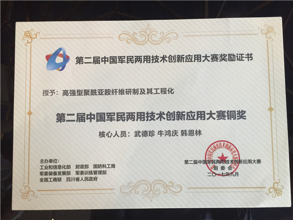 9月26日~29日,“第二屆中國軍民兩用技術(shù)創(chuàng)新應(yīng)用大賽決賽”在成都舉行,江蘇先諾新材料科技有限公司在武德珍董事長的帶領(lǐng)下,以半決賽小組*的名次晉級(jí)決賽,并取得創(chuàng)新組銅獎(jiǎng)的優(yōu)異成績。通過本次大賽,公司的高強(qiáng)型聚酰亞胺纖維產(chǎn)品在軍民兩用技術(shù)領(lǐng)域的重要應(yīng)用得到了充分展示,并獲得了廣泛關(guān)注。